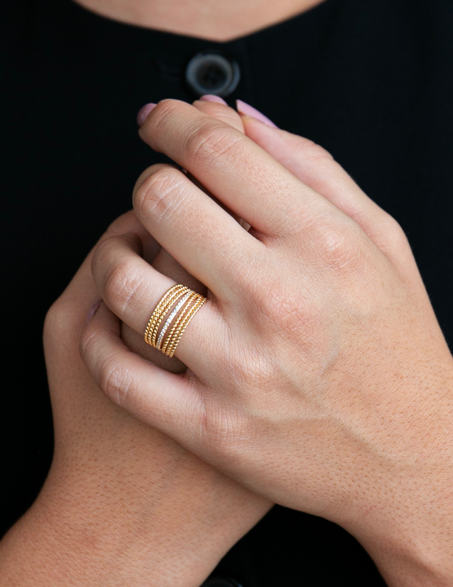 Raffinato e moderno, l’Anello Fascia Luminoso cattura la luce con eleganza grazie al suo design multifilo impreziosito da un sottile filo di zirconi bianchi che dona un tocco di brillantezza sofisticata.