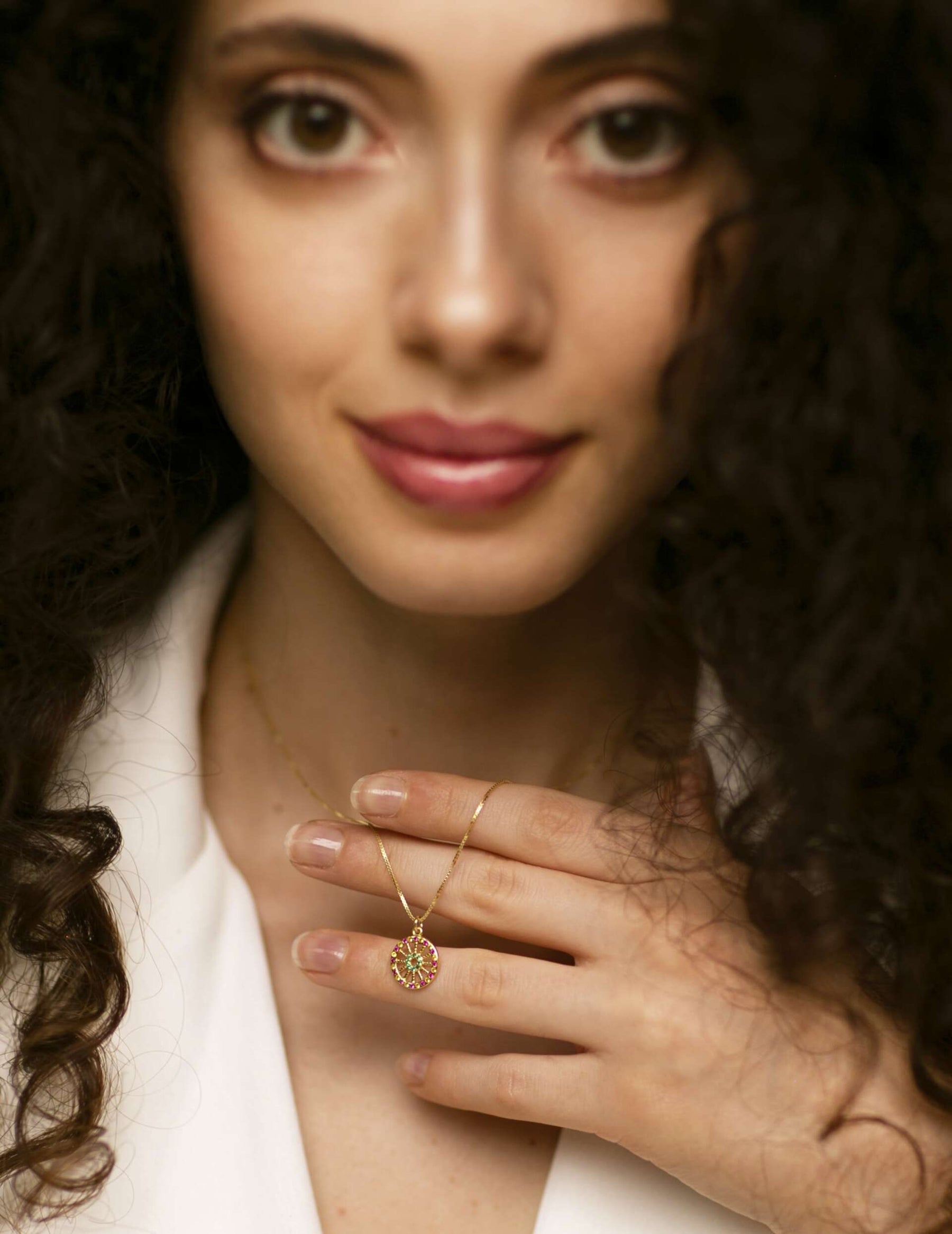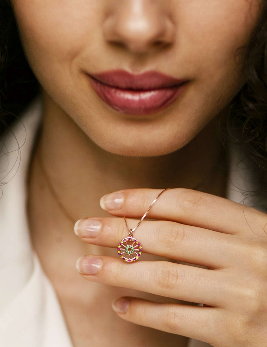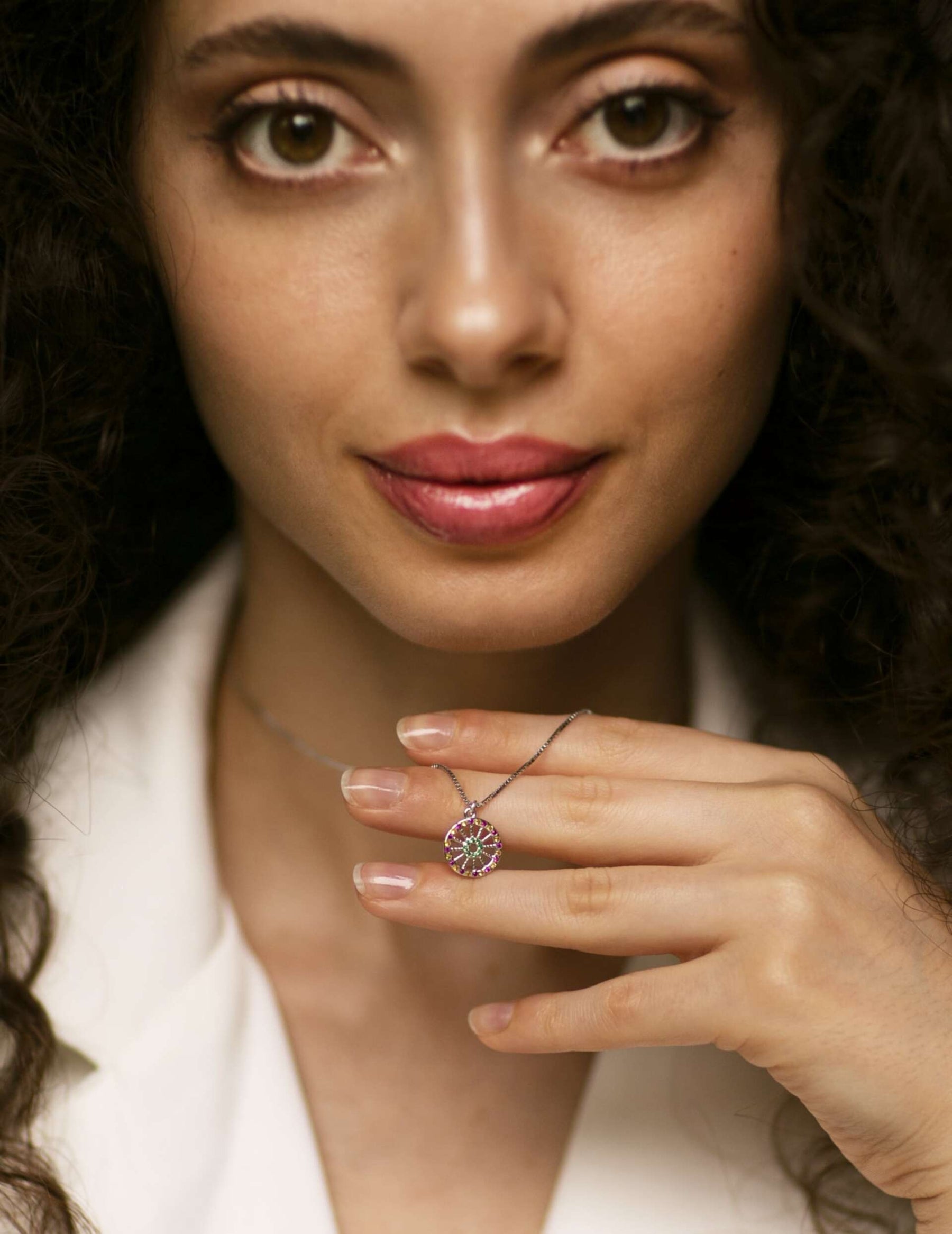 Un gioiello che celebra la tradizione siciliana con un tocco di luce moderna: il ciondolo a forma di ruota del carretto siciliano è realizzato a mano in argento 925 con zirconi colorati incastonati, per un effetto raffinato e brillante.