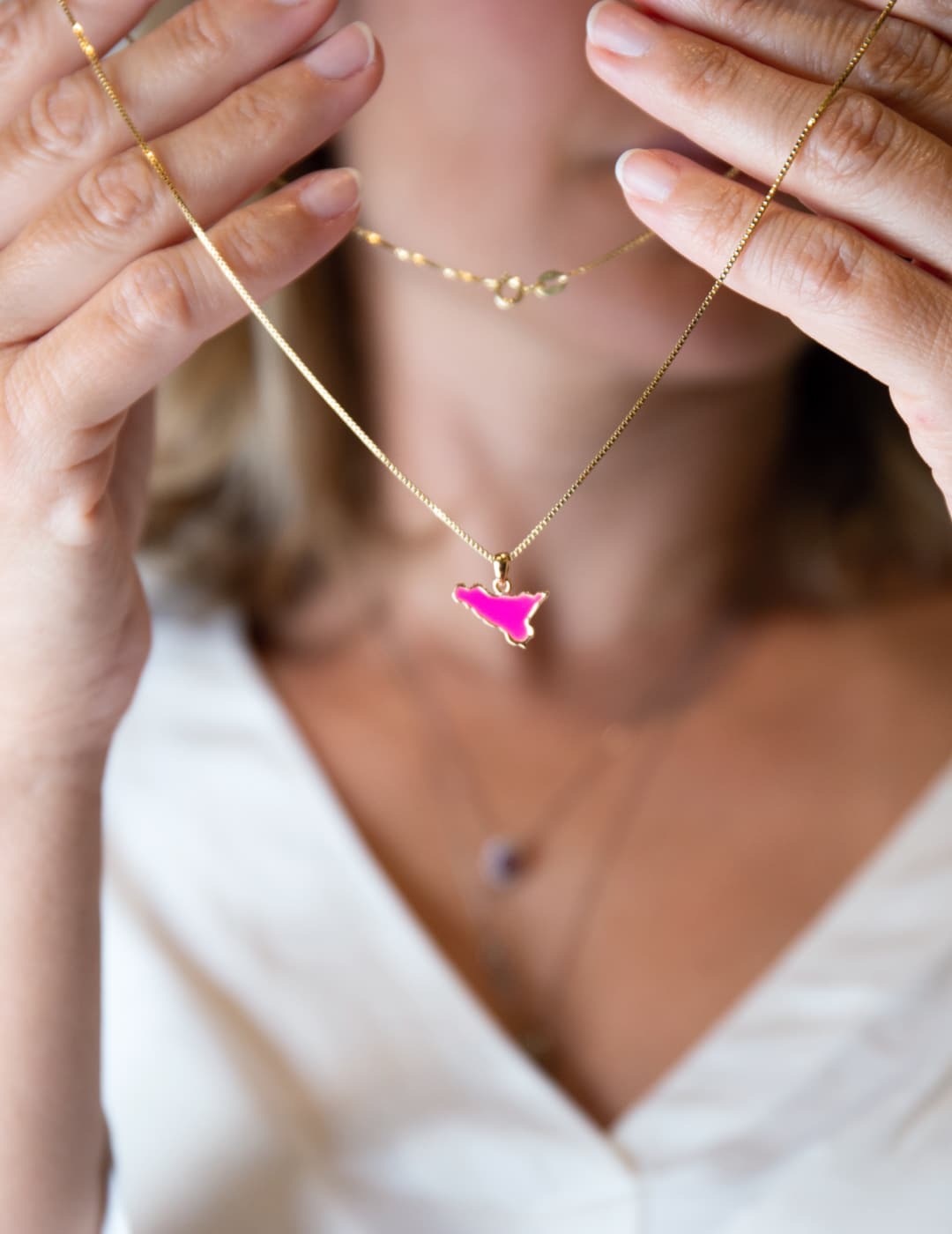Collana con ciondolo Sicilia smaltata e raffinato bordino dorato, simbolo dell’identità e del fascino della nostra isola.